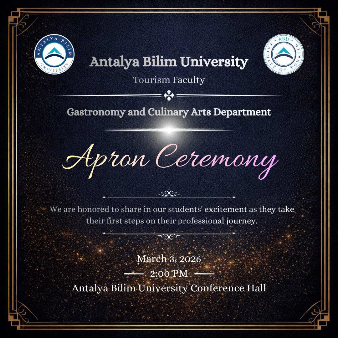 As the Department of Gastronomy and Culinary Arts at the School of Tourism, Antalya Bilim University, we gathered for this meaningful ceremony where our students would don their aprons—a symbol of their professional identity. This special day is not merely a moment of putting on an apron, but also the beginning of a professional journey dedicated to discipline, responsibility, and the culture of gastronomy. Our students shared this proud moment with their families, friends, and loved ones. We were also delighted to have all our stakeholders join us on this meaningful day.