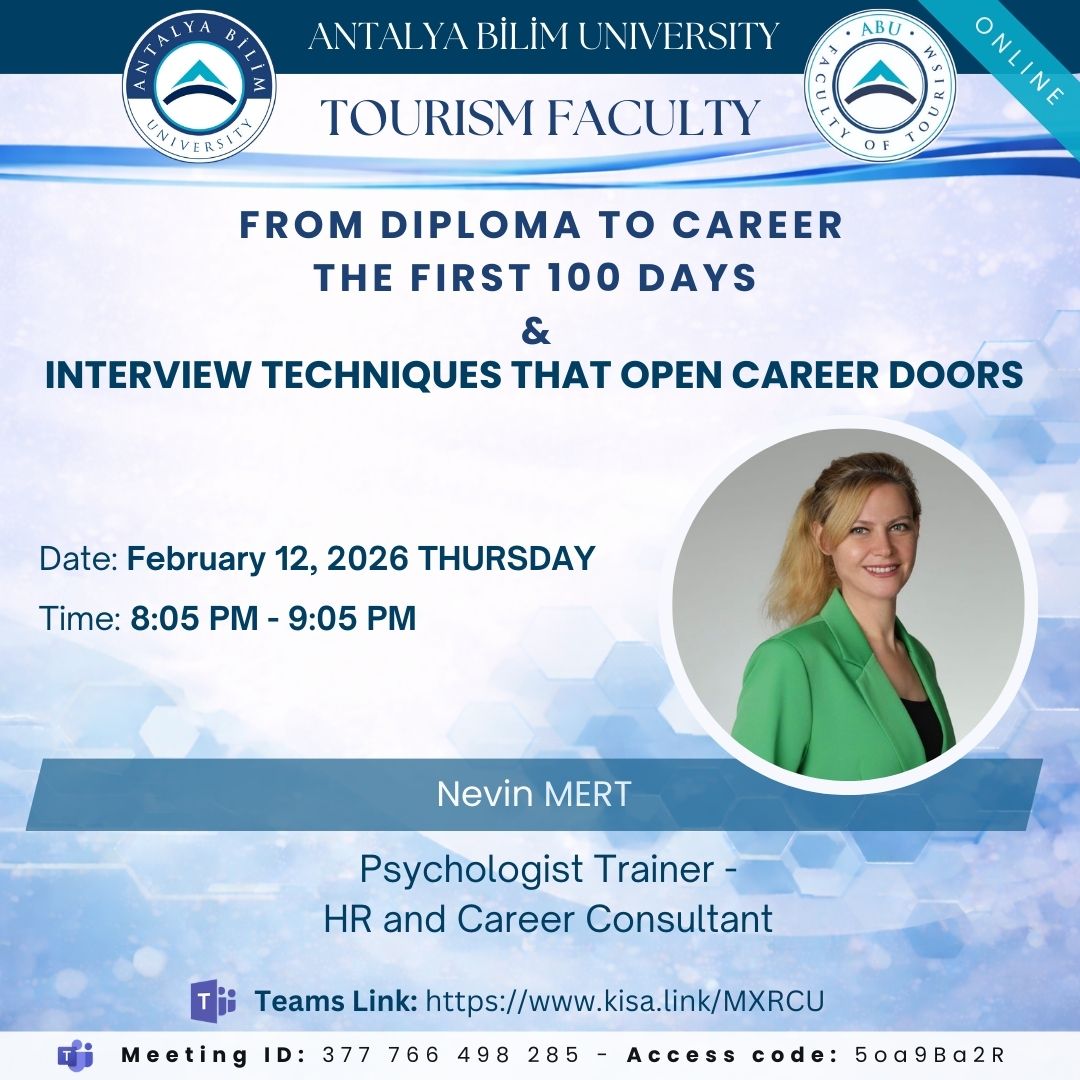 We are happy and honored to contribute to your success on this path we set out with the vision of raising tourism managers, leaders and entrepreneurs who will increase the competitive power of Antalya and our country in the tourism and hospitality sector, who can speak different foreign languages effectively, are open to innovation, think strategically, research, interpret, embrace continuous development and shape the future. Welcome to Antalya Bilim University Tourism Faculty.