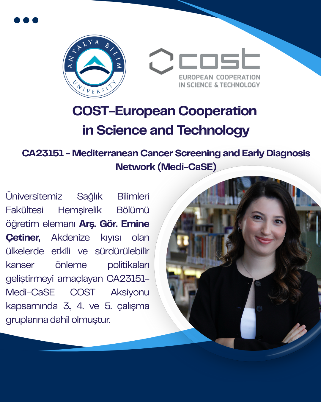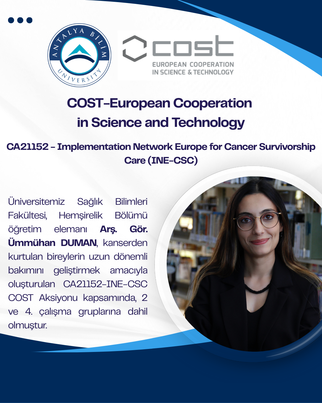 Hemşirelik Bölümü öğretim elemanı Arş. Gör. Ümmühan DUMAN kanserden kurtulan bireylerin uzun dönemli bakımını geliştirmek amacıyla oluşturulan CA21152- Integrated Network for Cancer Survivorship Care (INE-CSC) isimli COST (European Cooperation in Science and Technology) aksiyonu kapsamında, kanserden kurtulanların bakımını desteklemek için dijital çözümlerin uygulanması, kapasite geliştirme, yaygınlaştırma ve sürdürülebilirlik çalışma gruplarına dahil olmuştur.