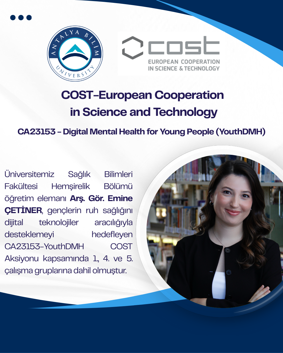 Üniversitemiz Sağlık Bilimleri Fakültesi Hemşirelik Bölümü öğretim elemanı Araştırma Görevlisi Emine ÇETİNER, dijital teknolojiler aracılığıyla gençlerin ruh sağlığını desteklemek amacıyla disiplinler arası ve kapsayıcı bir Avrupa ağı oluşturmayı hedefleyen CA23153-Digital Mental Health for Young People (YouthDMH) isimli COST Aksiyonu kapsamında gençlerin katılımı, disiplinlerarası inovasyon, teori, tasarım, uygulama, politika, etki ve yaygınlaştırma alanlarında yürütülen çalışma gruplarına dahil olmuştur.