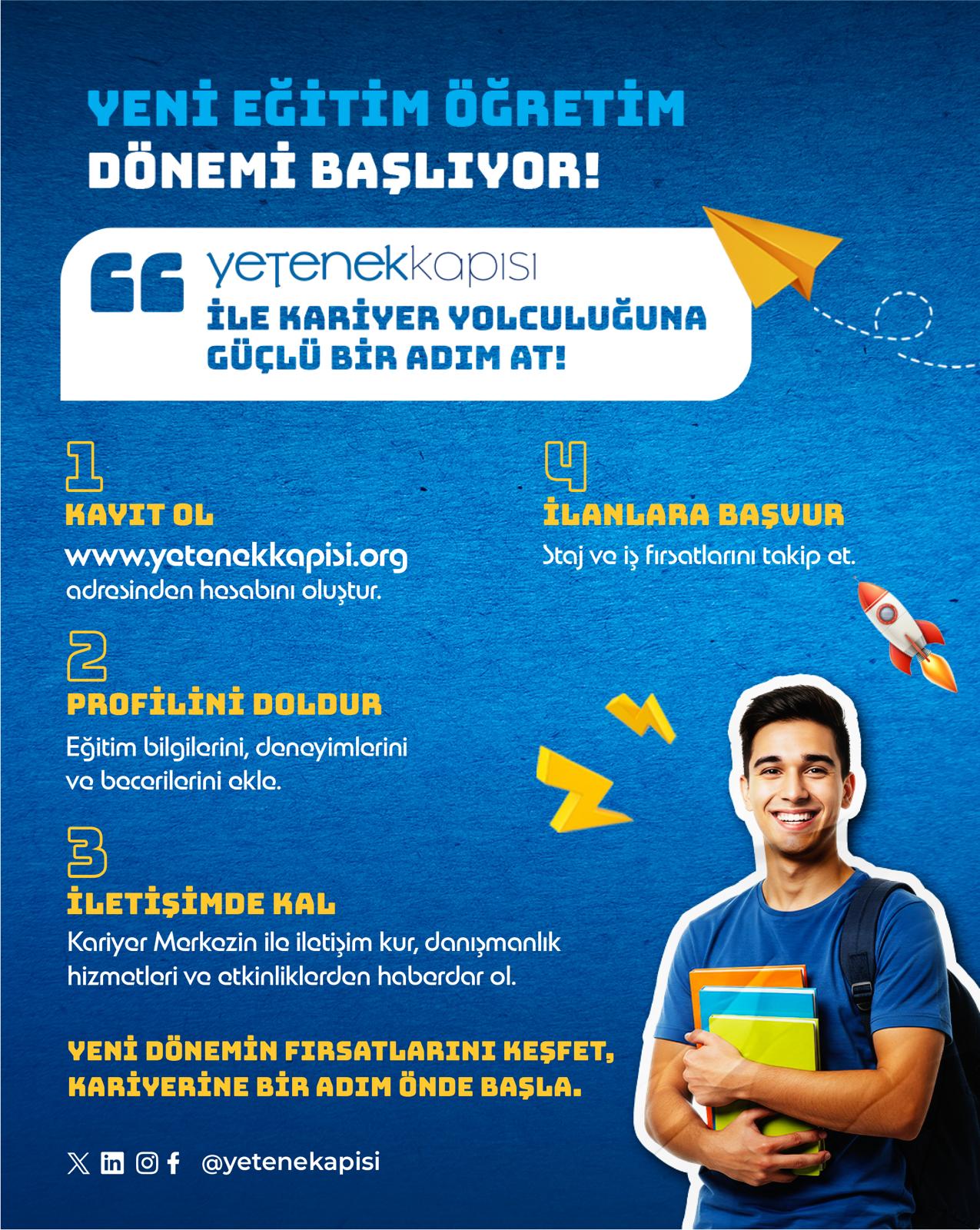 Yeni dönemde kariyerine yön vermek isteyen tüm üniversite öğrencileri Yetenek Kapısı platformuna davetli! Hem eğitim hayatını destekleyecek etkinliklere katılabilir hem de iş/staj ilanlarıyla profesyonel dünyaya adım atabilirsin. Profilini hemen oluştur, fırsatları keşfet!