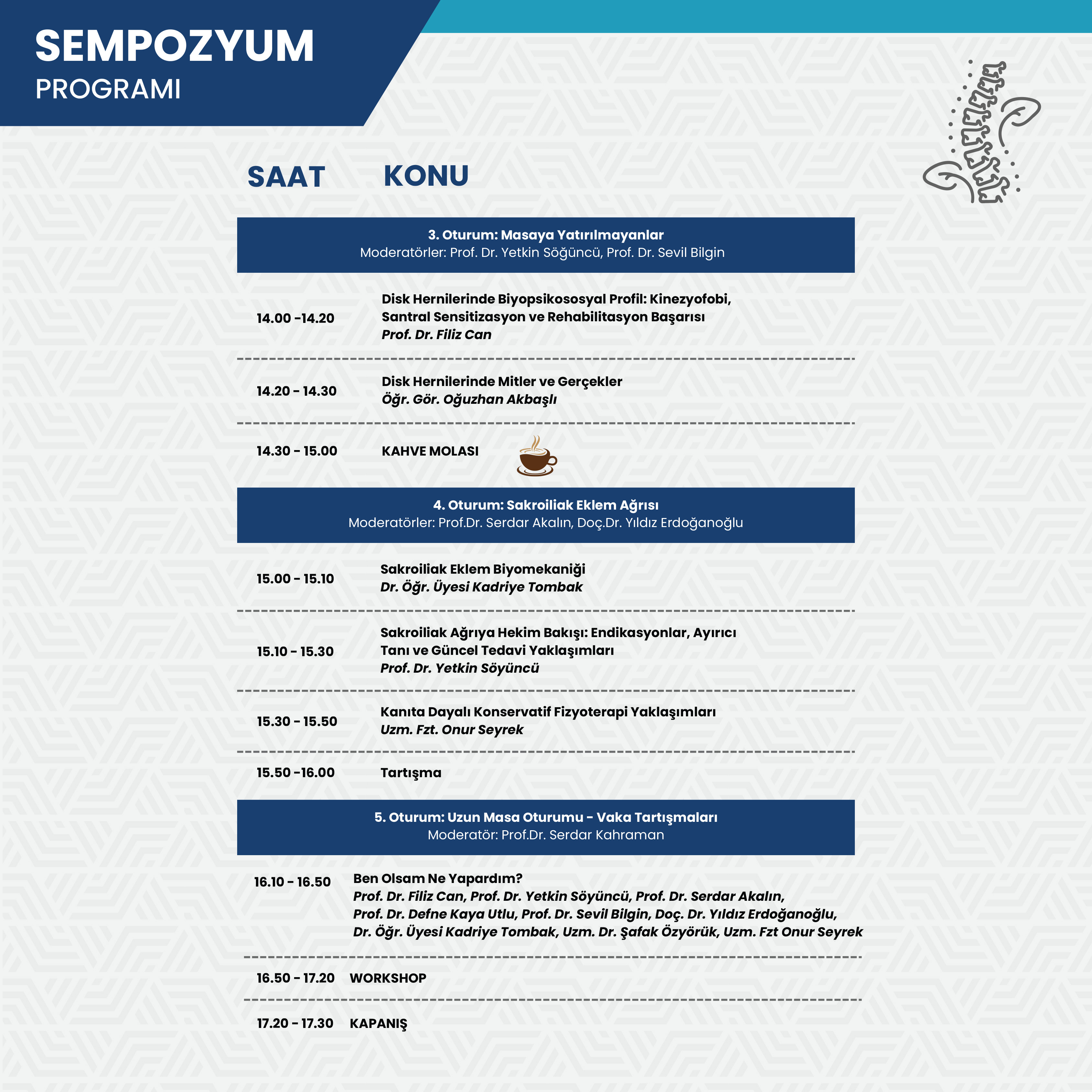 Sağlık Bilimleri Fakültesi Fizyoterapi ve Rehabilitasyon Bölümü tarafından düzenlenecek olan “Omurga Sağlığı Sempozyumu 3: Disk Hernilerine Güncel Yaklaşımlar” başlıklı etkinlikte; disk hernilerinin etiyolojisi, klinik değerlendirme süreçleri, güncel tedavi ve rehabilitasyon yaklaşımları bilimsel ve multidisipliner bir bakış açısıyla ele alınacaktır.