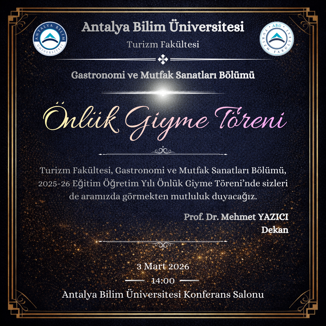 Antalya Bilim Üniversitesi Turizm Fakültesi Gastronomi ve Mutfak Sanatları Bölümü olarak, öğrencilerimizin mesleki kimliklerinin simgesi olan önlüklerini giyecekleri bu anlamlı törende bir araya geldik. Bu özel gün; yalnızca bir önlük giyme anı değil, aynı zamanda disiplin, sorumluluk ve gastronomi kültürüne adanmış bir mesleki yolculuğun başlangıcıdır. Öğrencilerimiz, bu gurur verici anı aileleri, arkadaşları ve sevdikleriyle paylaştılar Ayrıca bu anlamlı günde tüm paydaşlarımızı aramızda görmekten mutluluk duyduk.